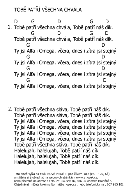 POŠTOVNÉ NEÚČTUJEME | TOBĚ PATŘÍ NAŠE CHVÁLA píseň z alba Nové písně 3 - Jméno Ježíš uctívám zpívá Jiří Zmožek a sbor | (MP3 ukázka >, Text se značkami >, Objednat >) |