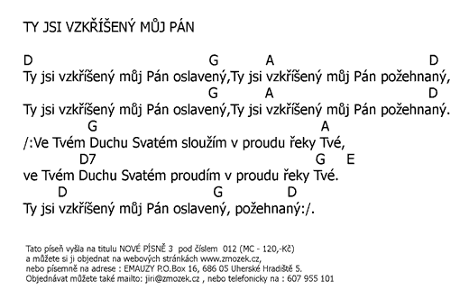 POŠTOVNÉ NEÚČTUJEME | TY JSI VZKŘÍŠENÝ MŮJ PÁN píseň z alba Nové písně 3 - Jméno Ježíš uctívám zpívá Jiří Zmožek a sbor | (MP3 ukázka >, Text se značkami >, Objednat >) |