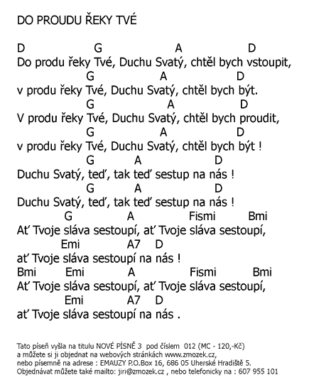 POŠTOVNÉ NEÚČTUJEME | DO PROUDU ŘEKY TVÉ píseň z alba Nové písně 3 - Jméno Ježíš uctívám zpívá Jiří Zmožek a sbor | (MP3 ukázka >, Text se značkami >, Objednat >) |