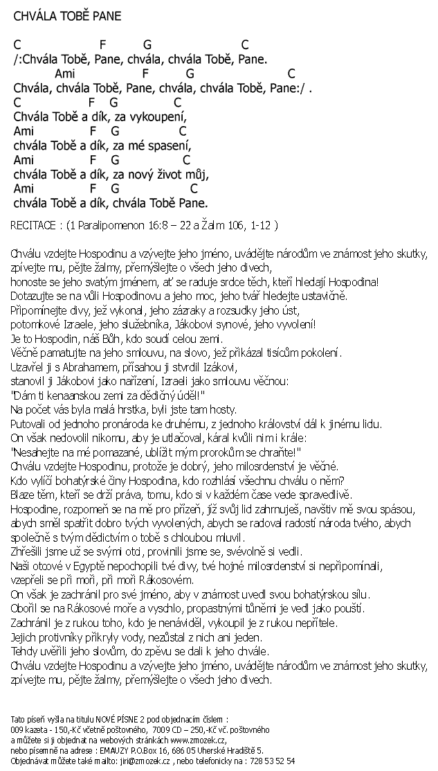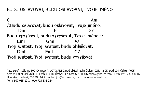 POŠTOVNÉ NEÚČTUJEME | BUDEM TĚ CHVÁLIT A BUDEM TĚ VZÝVAT vyšlo na albu Chvála a uctívání 1 zpívá Jiří Zmožek a sbor | (MP3 ukázka >, Text se značkami >, Objednat >) |