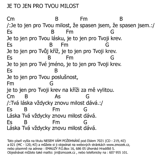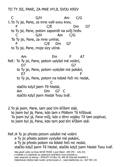 POŠTOVNÉ NEÚČTUJEME | TO TY JSI, PANE, ZA MĚ VYLIL SVOU KREV píseň z alba Nové písně 2 - Svatá Krev zpívá Jiří Zmožek | (MP3 ukázka >, Text se značkami >, Objednat >) |