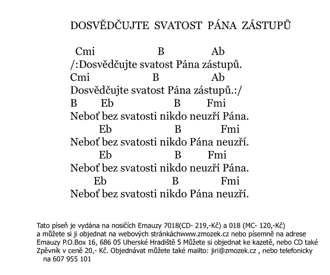 POŠTOVNÉ NEÚČTUJEME | DOSVĚDČUJTE SVATOST PÁNA ZÁSTUPŮ píseň z alba Chvála a uctívání 1 zpívá Jiří Zmožek a sbor | (MP3 ukázka >, Text se značkami >, Objednat >) |