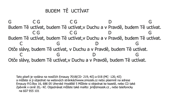POŠTOVNÉ NEÚČTUJEME | BUDEM TĚ UCTÍVAT píseň z alba Chvála a uctívání 1 zpívá Jiří Zmožek a sbor +slovo z Bible Jiří Zmožek | (MP3 ukázka >, Text se značkami >, Objednat >) |