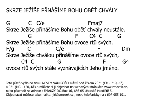 POŠTOVNÉ NEÚČTUJEME | SKRZE JEŽÍŠE PŘINÁŠÍME BOHU OBĚŤ CHVÁLY píseň z alba Nesem vám požehnání zpívají Jiří a Marcela Zmožkovi slovo z Bible čte Jiří Zmožek | (MP3 ukázka >, Text se značkami >, Objednat >) |