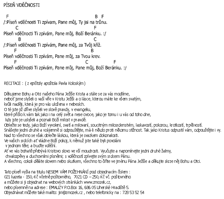 POŠTOVNÉ NEÚČTUJEME | PÍSEŇ VDĚČNOSTI píseň z alba Nesem vám požehnání zpívají Jiří a Marcela Zmožkovi slovo z Bible čte Jiří Zmožek | (MP3 ukázka >, Text se značkami >, Objednat >) |