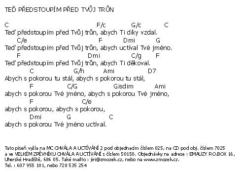 | TEĎ PŘEDSTOUPÍM PŘED TVŮJ TRŮN píseň z alba Chvála a uctívání 2 zpívá Jiří Zmožek a sbor | (MP3 ukázka >, Text se značkami >, Objednat >) |