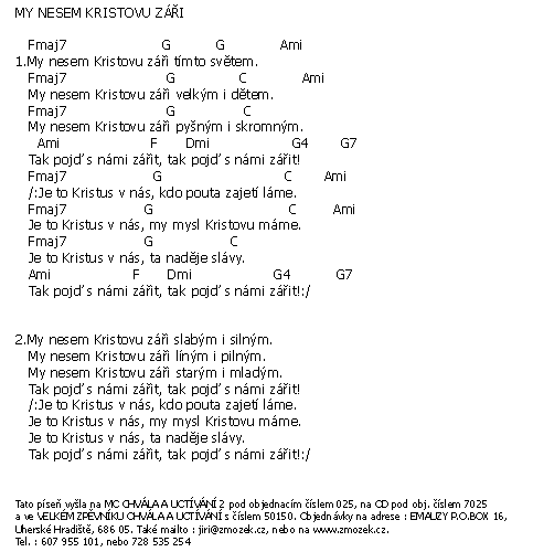 | MY NESEM KRISTOVU ZÁŘI píseň z alba Chvála a uctívání 2 zpívá Jiří Zmožek a sbor | (MP3 ukázka >, Text se značkami >, Objednat >) |