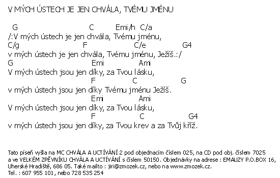 | V MÝCH ÚSTECH JE JEN CHVÁLA TVÉMU JMÉNU píseň z alba Chvála a uctívání 2 zpívá Jiří Zmožek a sbor | (MP3 ukázka >, Text se značkami >, Objednat >) |