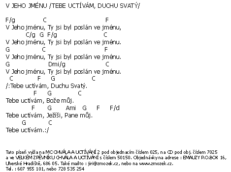 | V JEHO JMÉNU vyšlo na albu Chvála a uctívání 2 zpívá Jiří Zmožek a sbor | (MP3 ukázka >, Text se značkami >, Objednat >) |