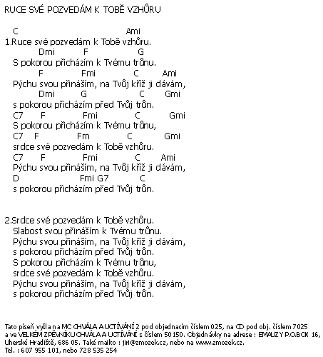 | RUCE SVÉ POZVEDÁM K TOBĚ VZHŮRU píseň z alba Chvála a uctívání 2 zpívá Jiří Zmožek a sbor | (MP3 ukázka >, Text se značkami >, Objednat >) |