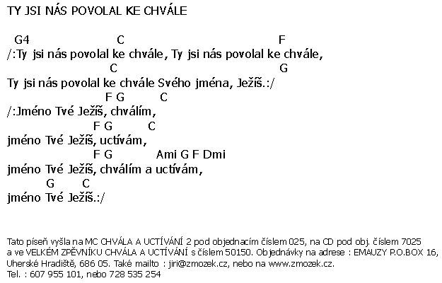| TY JSI NÁS POVOLAL KE CHVÁLE píseň z alba Chvála a uctívání 2 zpívá Jiří Zmožek a sbor | (MP3 ukázka >, Text se značkami >, Objednat >) |