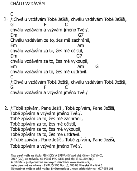 POŠTOVNÉ NEÚČTUJEME | CHVÁLU VZDÁVÁM TOBĚ JEŽÍŠI vyšlo na albu Písničky a zpívánky zpívá Marcela Zmožková | (MP3 ukázka >, Text se značkami >, Objednat >) |
