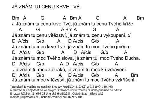 POŠTOVNÉ NEÚČTUJEME | JÁ ZNÁM TU CENU KRVE TVÉ vyšlo na albu Můj Bůh uzdravuje zpívá Jiří Zmožek a sbor | (MP3 ukázka >, Text se značkami >, Objednat >) |