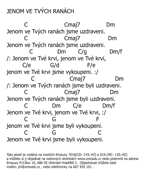 POŠTOVNÉ NEÚČTUJEME | JENOM VE TVÝCH RANÁCH vyšlo na albu Můj Bůh uzdravuje zpívá Jiří Zmožek a sbor | (MP3 ukázka >, Text se značkami >, Objednat >) |