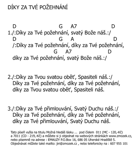 POŠTOVNÉ NEÚČTUJEME | DÍKY ZA TVÉ POŽEHNÁNÍ píseň z alba Možná hledáš lásku - Kytarový klub 1 zpívá mládež z Kytarového klubu | (MP3 ukázka >, Text se značkami >, Objednat >) |